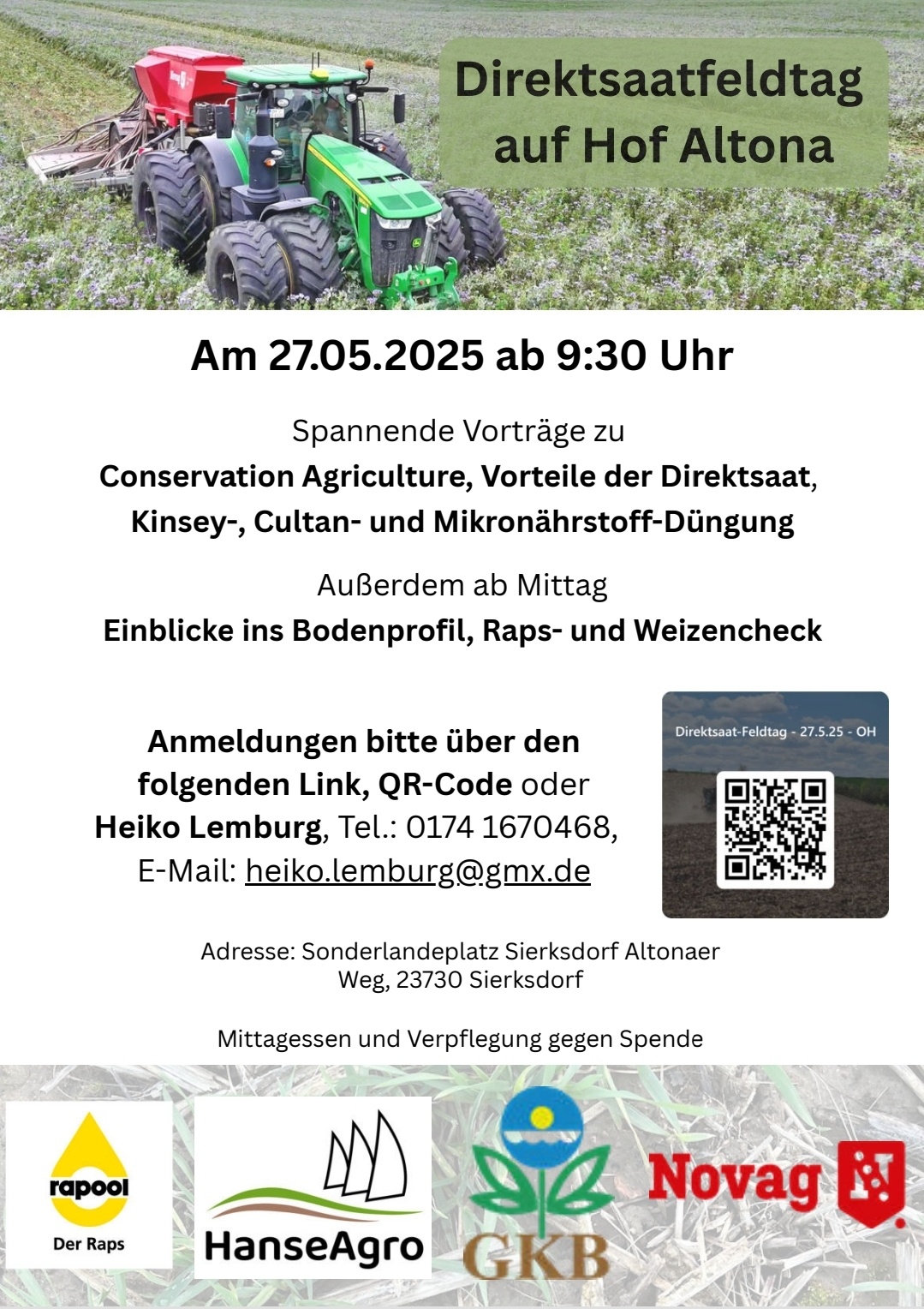 Am 27.05.2025 findet auf dem Hof Altona in Sierksdorf in Schleswig-Holstein ein Direktsaatfeldtag statt.