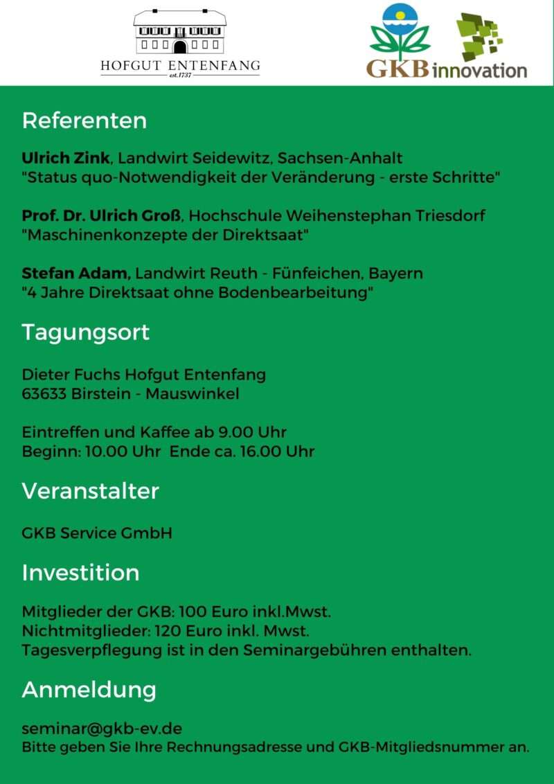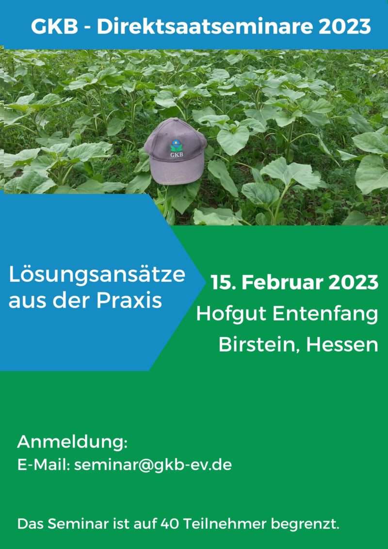 Das Direktsaatseminar in Birstein ist ausgebucht – Die GKB e.V. Direktsaatseminare 2023 – mit diesem neuen Format wollen wir in diesem Jahr eine Reihe von Veranstaltungen in verschiedenen Bundesländern zum Thema Direktsaat anbieten. Das nächste Direktsaatseminar findet am 15.02.2023 in Hessen von 10.00 bis 16.00 Uhr auf dem Hofgut Entenfang, Betrieb Dieter Fuchs in 63633 Birstein / Hessen statt.