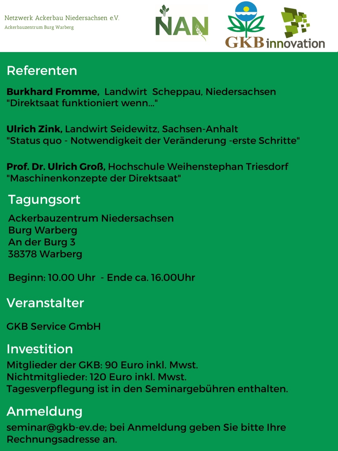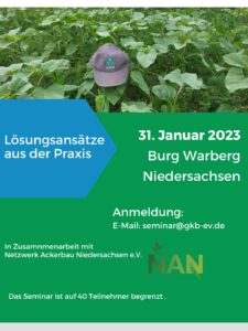 Das Seminar ist aktuell ausgebucht – nur Warteliste. GKB e.V. Direktsaatseminare 2023 – mit diesem neuen Format wollen wir in diesem Jahr eine Reihe von Veranstaltungen in verschiedenen Bundesländern zum Thema Direktsaat anbieten. Mit der Veranstaltung am 31.01.2023 erfolgt die Auftaktveranstaltung zum Thema „Lösungsansätze aus der Praxis, Praktikerberichte“.