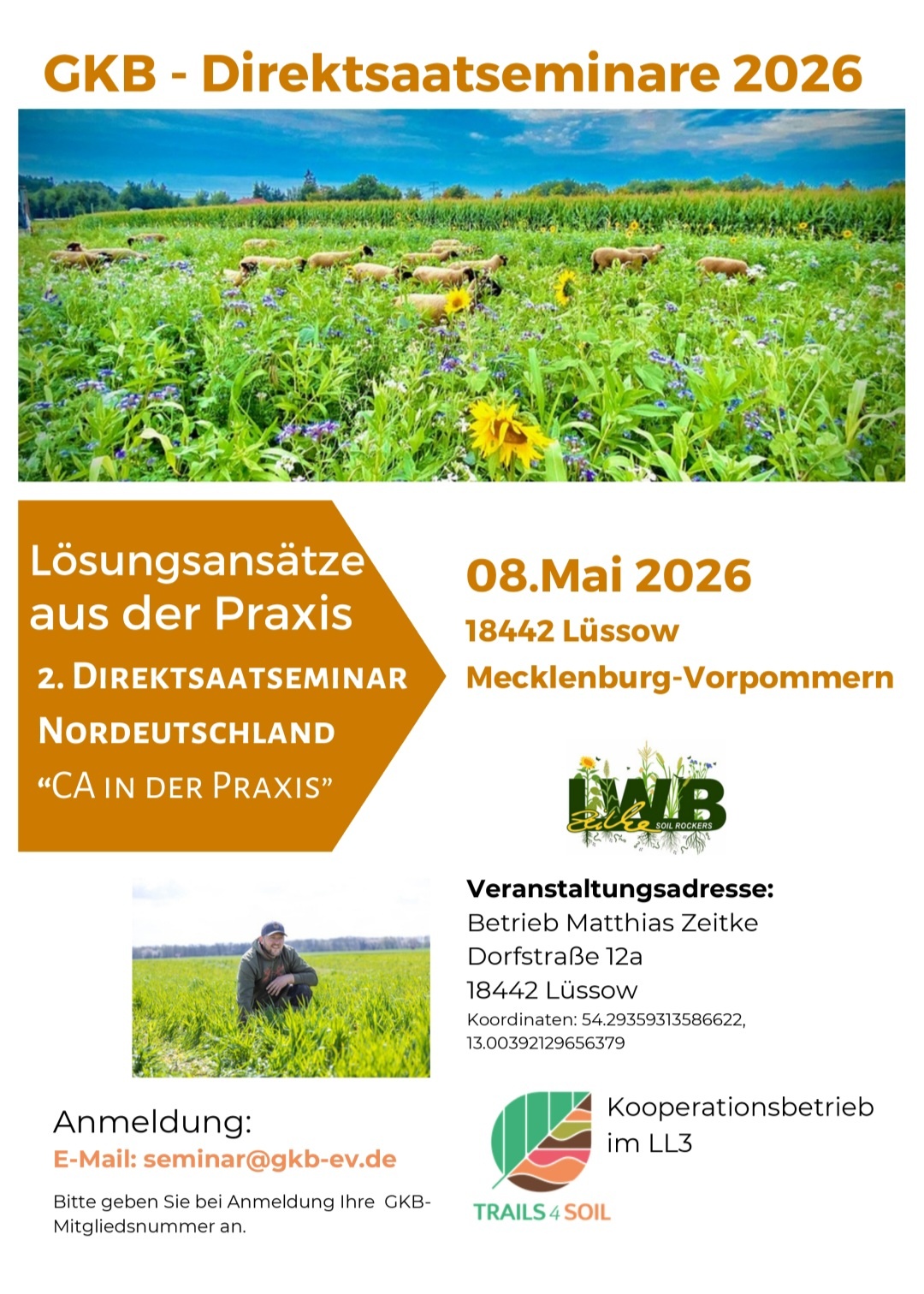 Die GKB e.V. Direktsaatseminare werden fortgesetzt – im Jahr 2023 begann eine Reihe von Veranstaltungen in verschiedenen Bundesländern zum Thema Direktsaat. Mit der Veranstaltung am 08.05.2026 im Betrieb Matthias Zeitke in 18442 Lüssow setzen wir das Format weiter fort und gehen damit nach Norddeutschland.