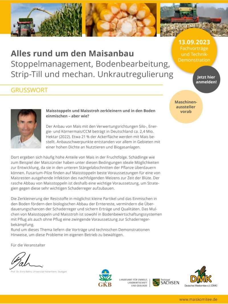 Am Nachmittags werden bei einer Maschinenvorführung der Einsatz von aktiven und passiven Geräten zur Zerkleinerung von Stoppelresten nach Silomais sowie von Geräten zur Bodenbearbeitung, die Demonstration der Silomaisernte mit gleichzeitiger intensiver Maisstoppel-Zerkleinerung, die mechanische Unkrautregulierung mittels Hacke und Striegel sowie Strip-Till-Verfahren zu sehen sein. Den Flyer zu der Veranstaltung können Sie unter dem folgenden Link downloaden.