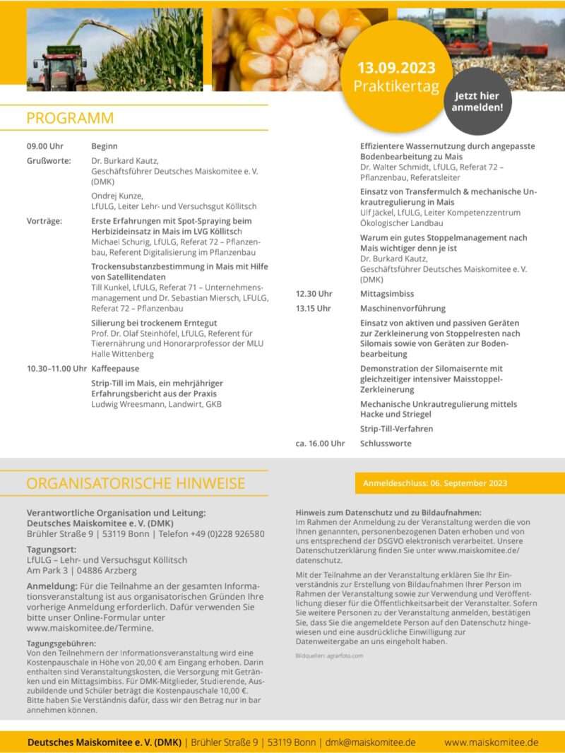 Am 13.09.2023 findet der Praktikertag des Deutschen Maiskomitee e.V. „Alles rund um den Maisanbau“ auf dem LfULG – Lehr- und Versuchsgut Köllitsch, Am Park 3 in 04886 Arzberg statt.