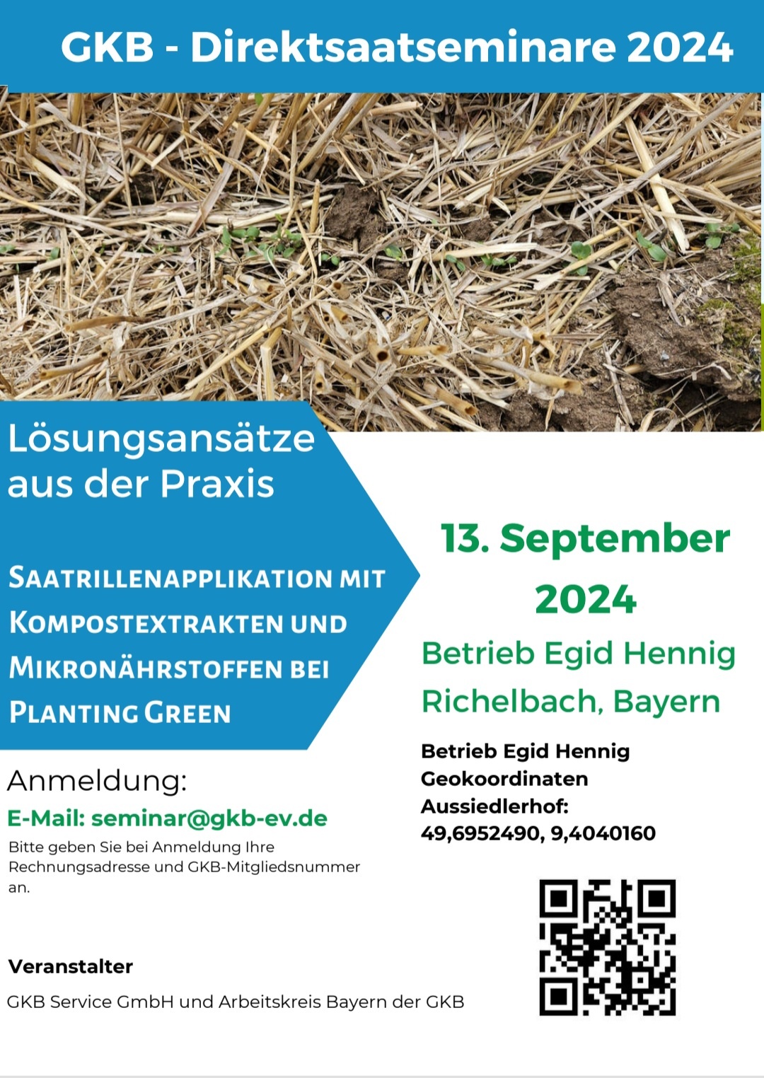 GKB e.V. Direktsaatseminare 2024 – mit diesem neuen Format begann im letzten Jahr eine Reihe von Veranstaltungen in verschiedenen Bundesländern zum Thema Direktsaat. Mit der Veranstaltung am 13.09.2024 auf dem Betrieb von Betrieb Egid Hennig in Richelbach / Bayern setzen wir das Format weiter fort.