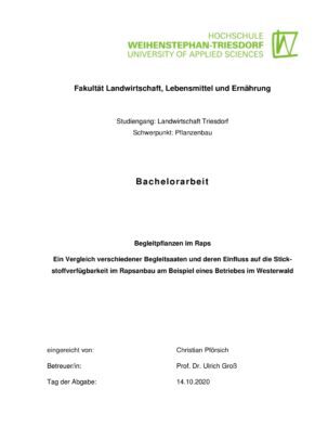 Im Rahmen des GKB Ringversuches zum Thema „Begleitpflanzen im Raps“ wurden auf dem Gut Westerwald Versuchsergebnisse von zwei Anbaujahren im Rahmen einer Bachelorarbeit ausgewertet. Die Bachelorarbeit wurde von Herrn Christian Pförsich an der HSWT Weihenstephan-Triesdorf mit dem Titel: „Begleitpflanzen im Raps – Ein Vergleich verschiedener Begleitsaaten und deren Einfluss auf die Stickstoffverfügbarkeit im Rapsanbau am Beispiel eines Betriebes im Westerwald“ bei Herrn Prof. Ulrich Groß angefertigt und abgeschlossen.