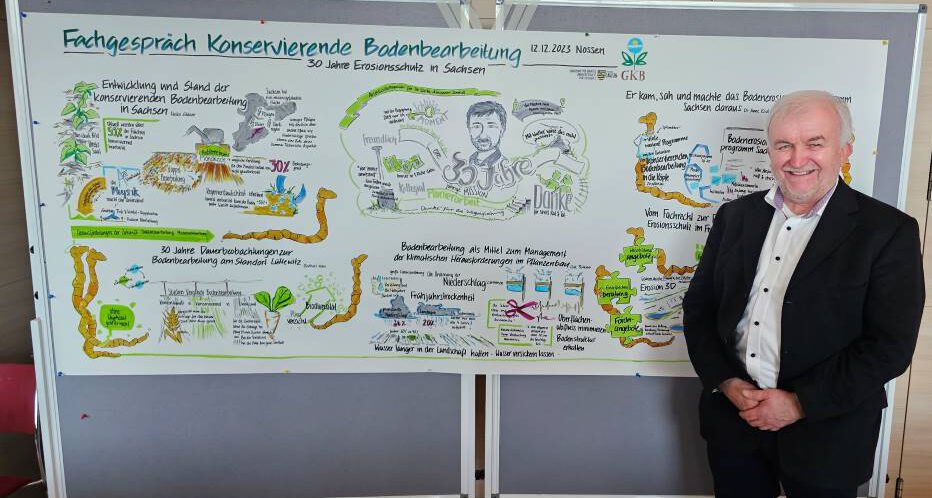 Am 12. Dezember 2023 fand am Sächsischen Landesamt für Umwelt, Landwirtschaft und Geologie (LfULG) in Nossen das Fachgespräch „Konservierende Bodenbearbeitung – 30 Jahre Erosionsschutz in Sachsen“ statt, welches zeitgleich das Abschlusskolloquium für Dr. Walter-Alexander Schmidt war.