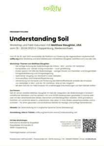 Vom 19. April bis 20. April 2023 veranstaltet die Plattform zur Förderung der regenerativen Landwirtschaft soilify.org einen Workshop zum Thema Understanding Soil und eine Feldexkursion mit Matthew Slaughter (earthfort.com) aus den USA.