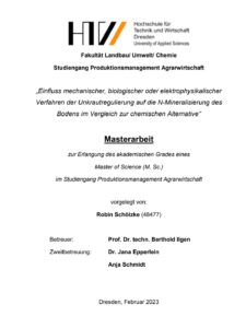 Masterarbeit zur Erlangung des akademischen Grades eines Master of Science (M. Sc.) im Studiengang Produktionsmanagement Agrarwirtschaft zum Thema „Einfluss mechanischer, biologischer oder elektrophysikalischer Verfahren der Unkrautregulierung auf die N-Mineralisierung des Bodens im Vergleich zur chemischen Alternative“ – vorgelegt bei Prof. Dr. techn. Berthold Ilgen von Robin Schölzke